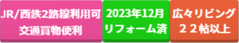 | 特徴 | JR/西鉄2路線利用可な便利な立地 広々3LDK・リビング22帖以上 内装リフォーム済(2023年12月)内訳:キッチン・浴室・洗面化粧台・クロス・フローリング・間取り変更等 |