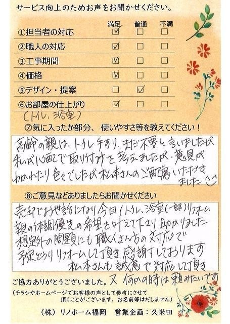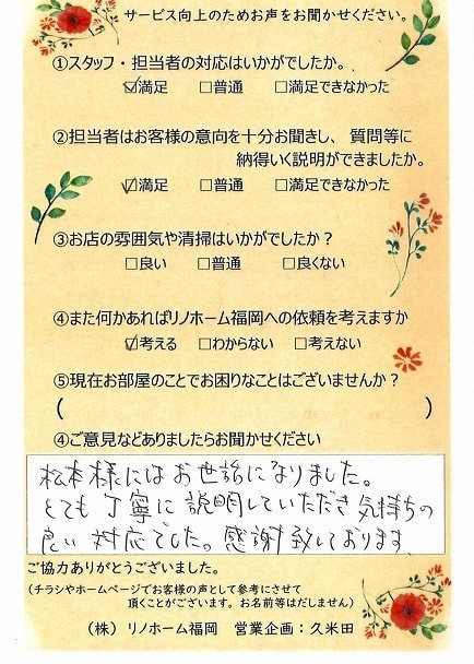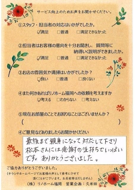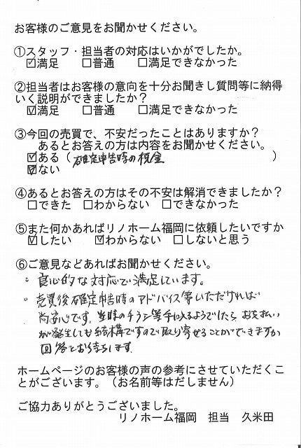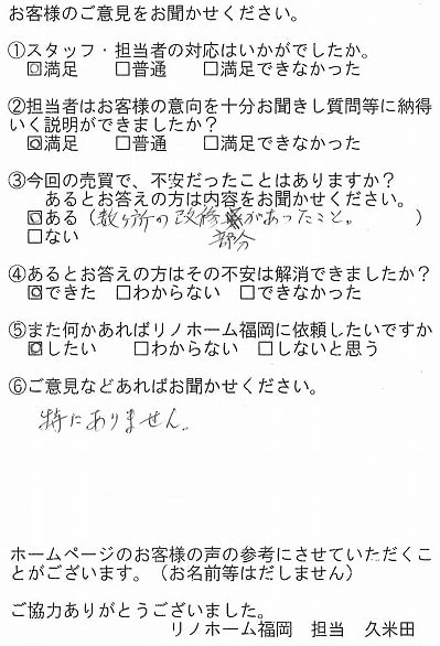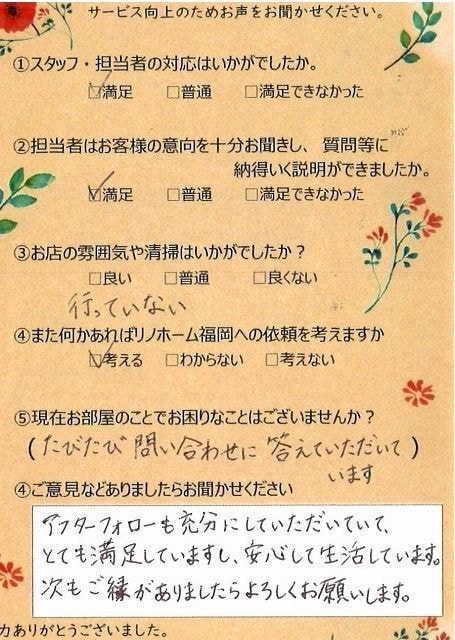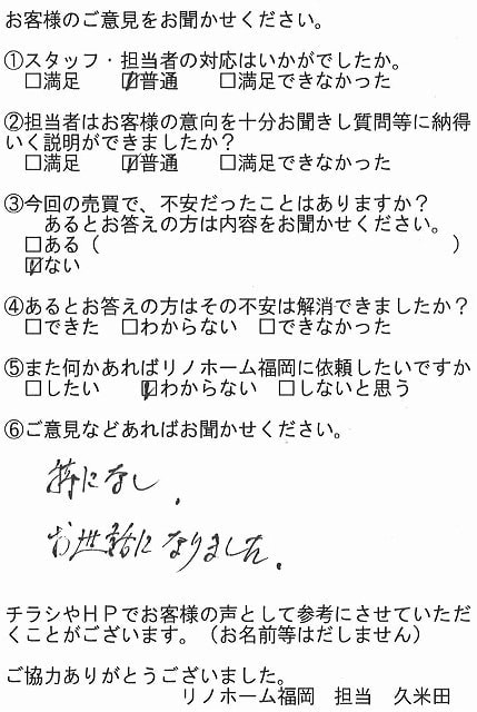 | 早良区 百道タワーをご売却のお客様 | リノホーム福岡の松本さんの仲介で購入した部屋でしたので、売却も松本さんにお願いしようと決めていました。購入した時もスピーディーに段取り良く動いて頂き購入できました。今回の売買も、依頼から引き渡しまでスムーズにいき、お願いしてよかったと思っています。 |