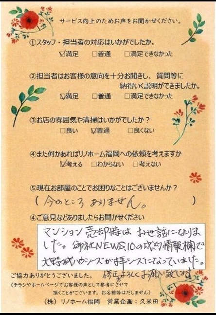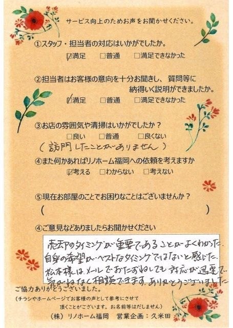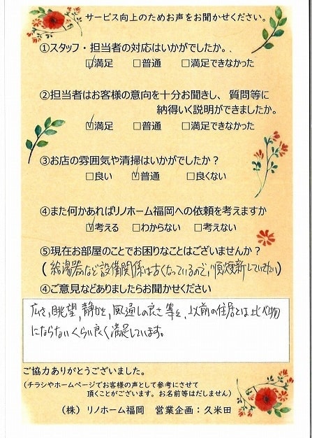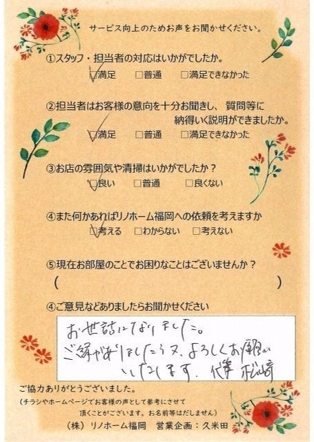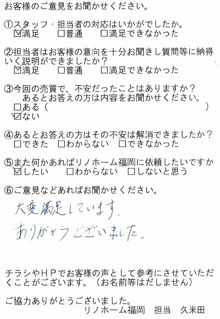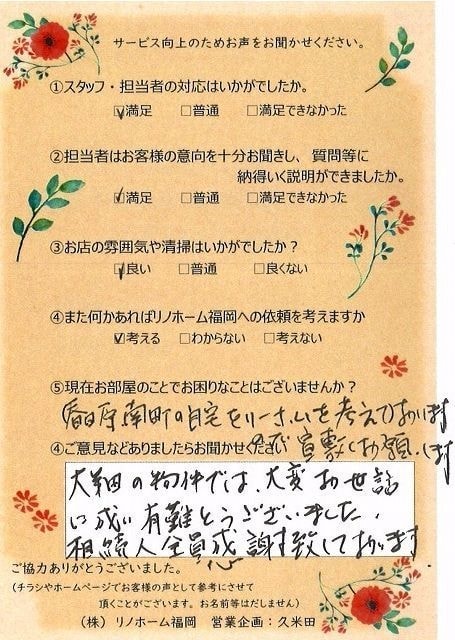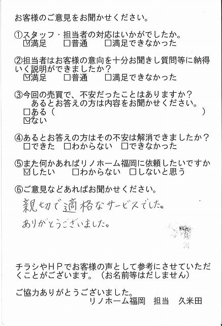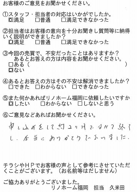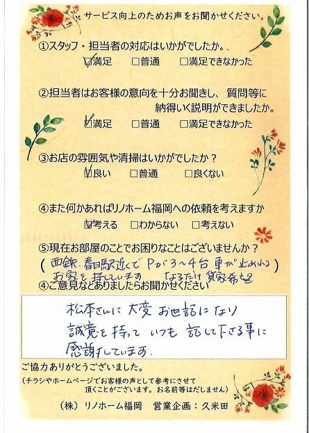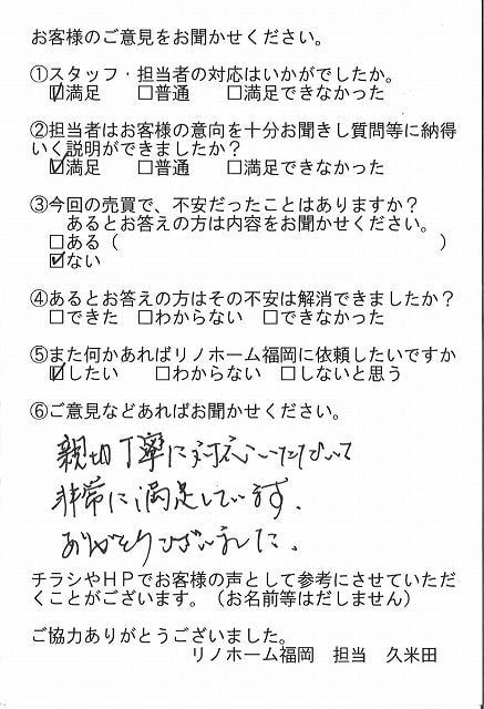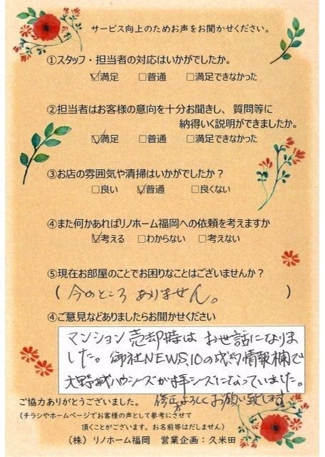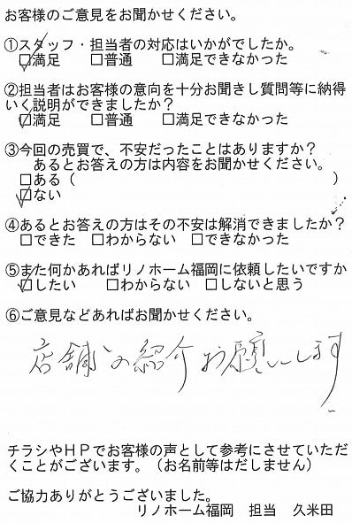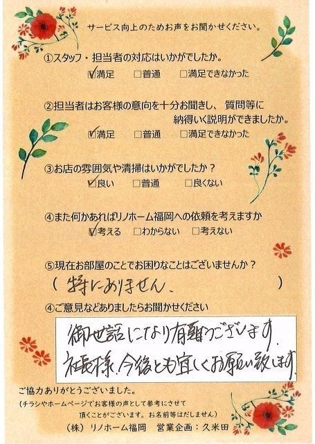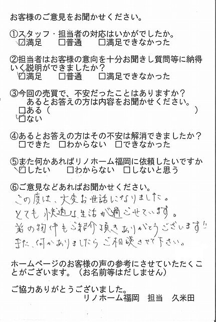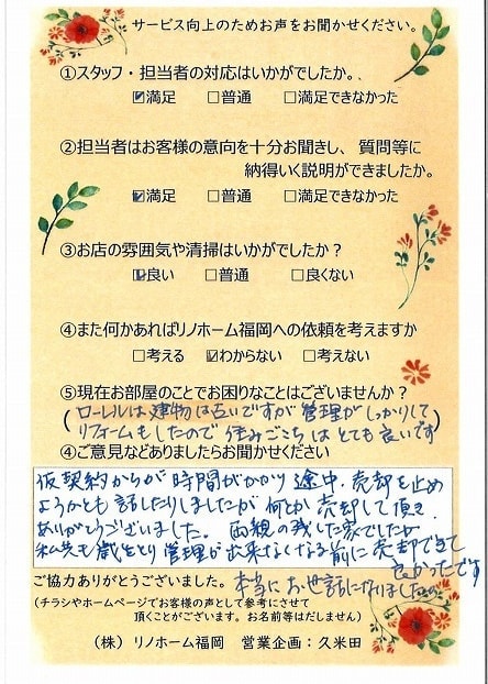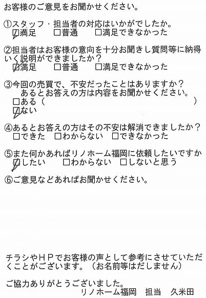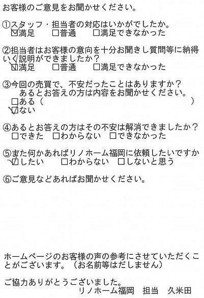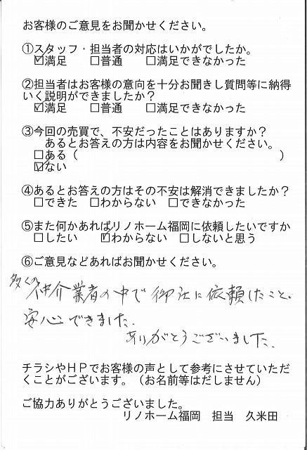 | 早良区 マンションご購入のお客様 | その節は、大変お世話になりました。リノホームさんへお願いしてからすぐに、買い手が見つかり、思っていた以上に高値で売っていただきました。我家は、親のマンションと私達(長男夫婦)のマンションと2件一緒に売り出し、どちらとも、いい条件のもと、売却することができました。リノホームさんにお願いしてよかったと、家族みんな感謝しています。 |
