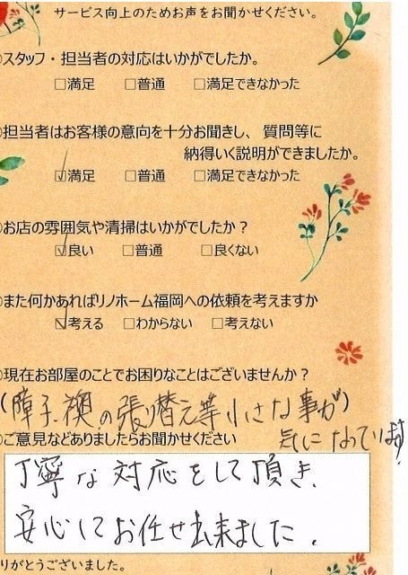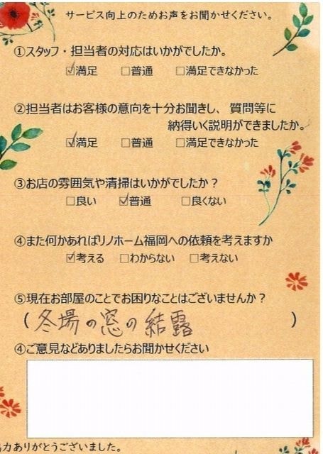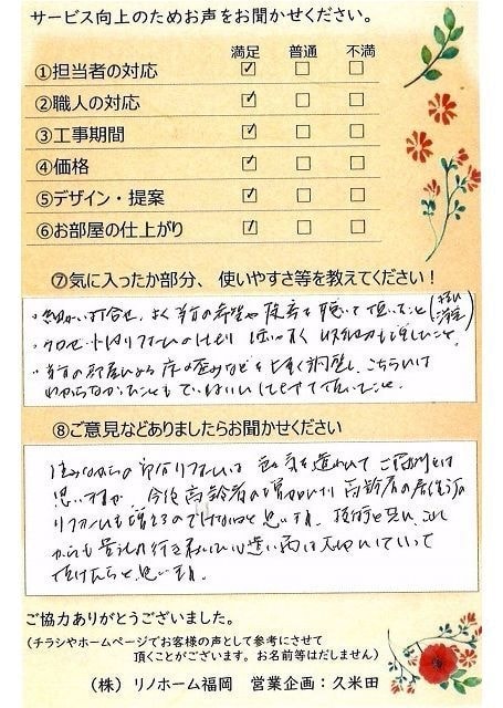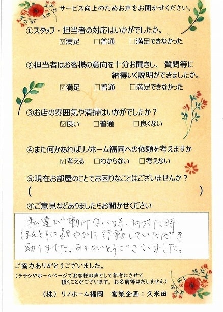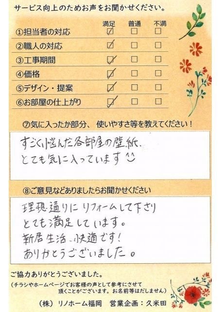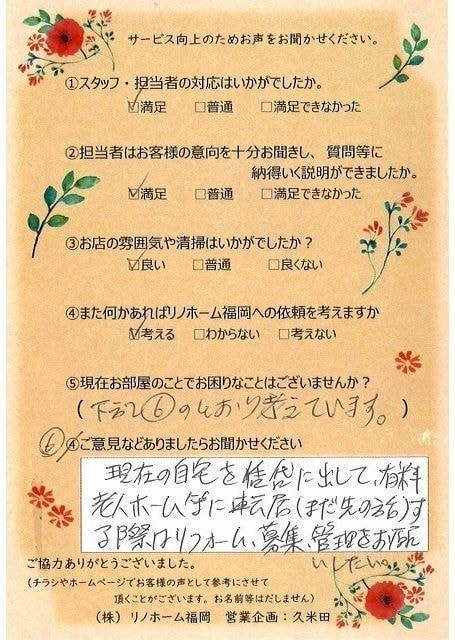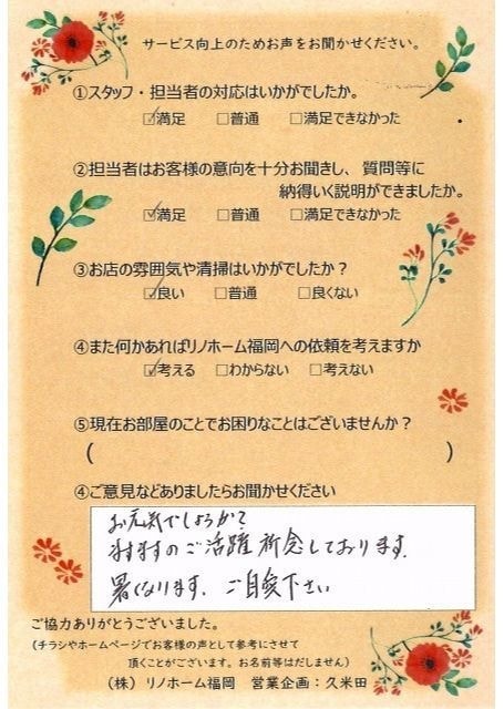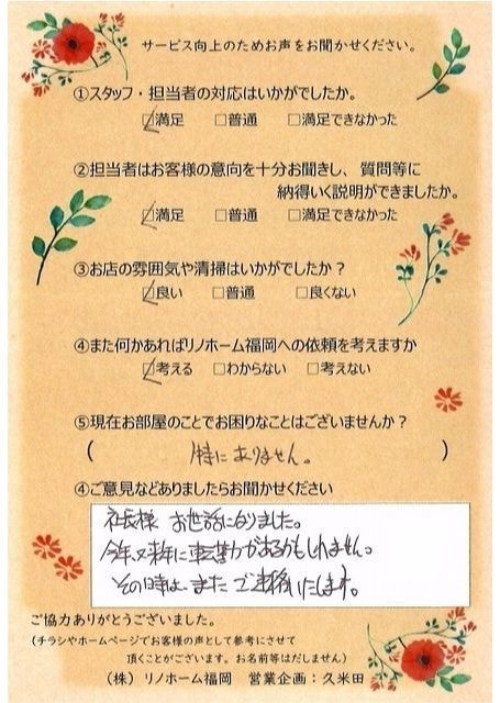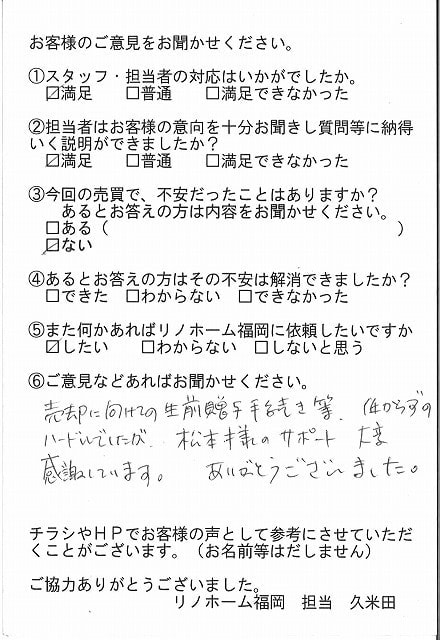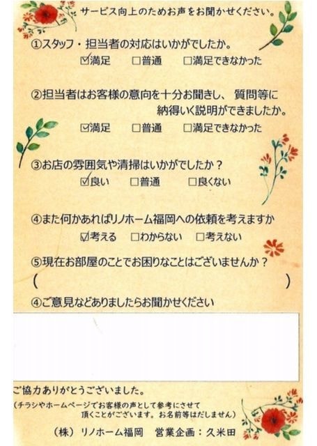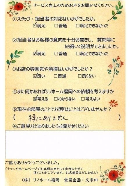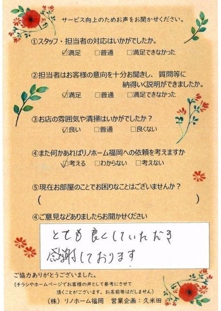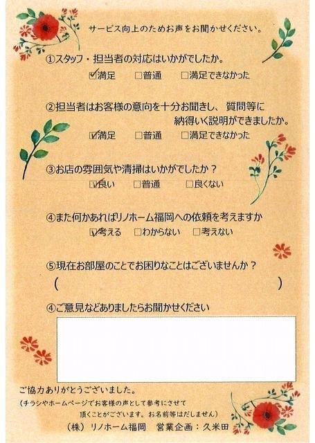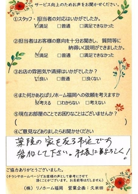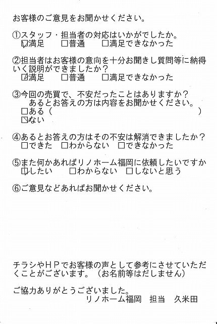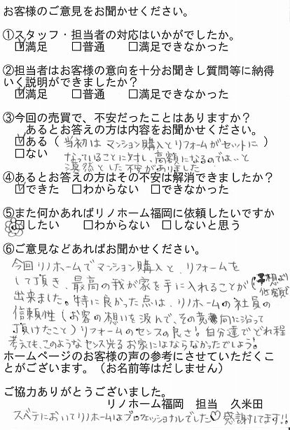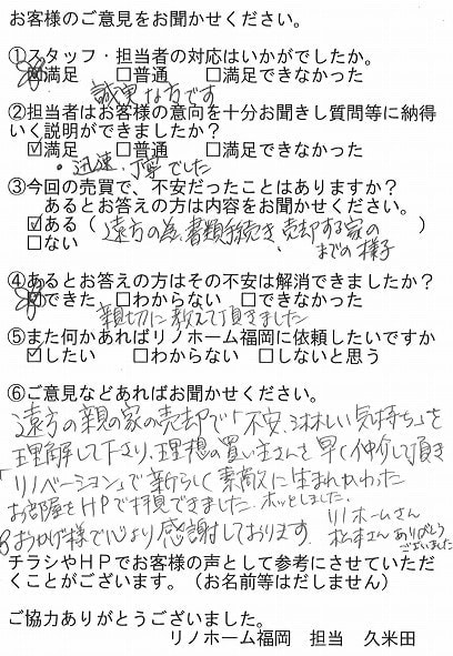 | 早良区 マンションご購入のお客様 | その節は、大変お世話になりました。リノホームさんへお願いしてからすぐに、買い手が見つかり、思っていた以上に高値で売っていただきました。我家は、親のマンションと私達(長男夫婦)のマンションと2件一緒に売り出し、どちらとも、いい条件のもと、売却することができました。リノホームさんにお願いしてよかったと、家族みんな感謝しています。 |