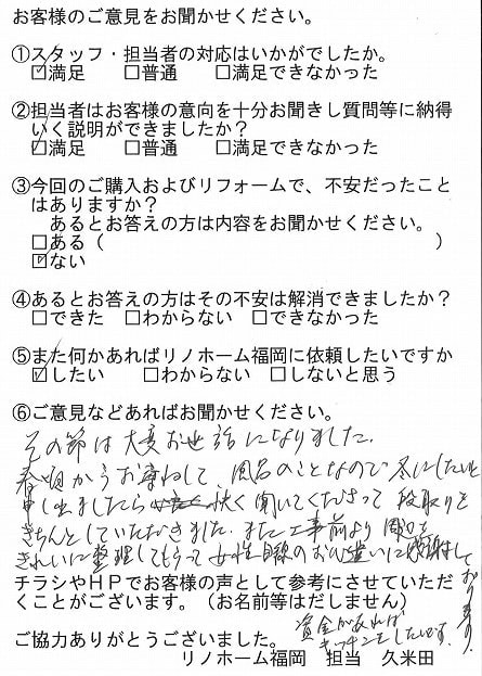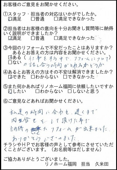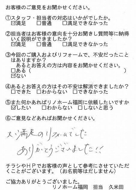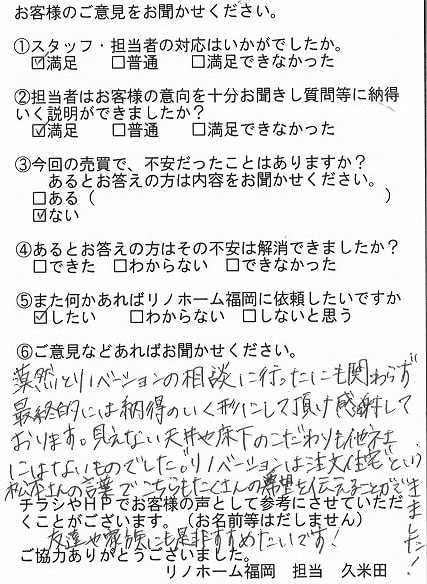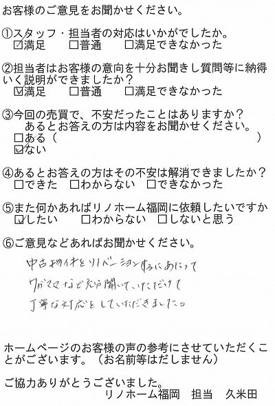 | 福岡市中央区 マンションを購入のお客様 | 中古物件をリノベーションするにあたってワガママなどを充分聞いていただけて丁寧な対応をしていただきました。 |