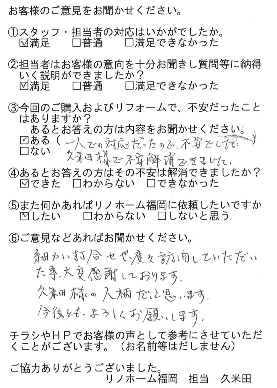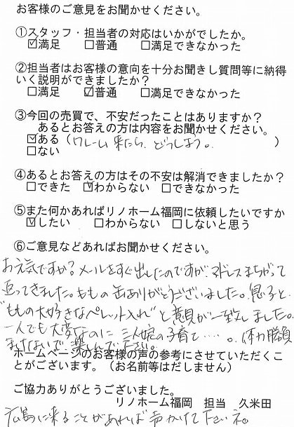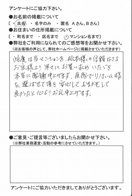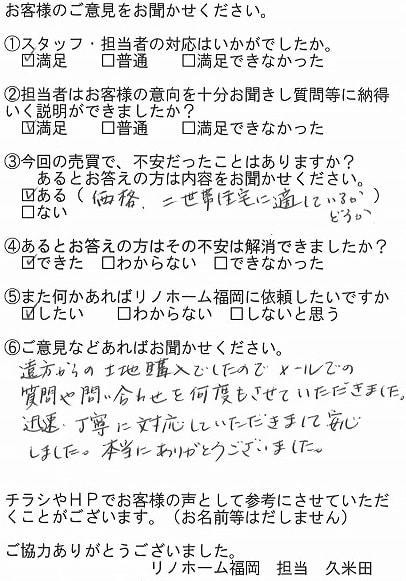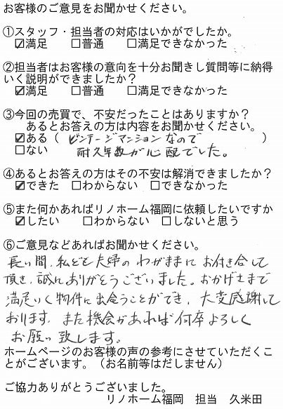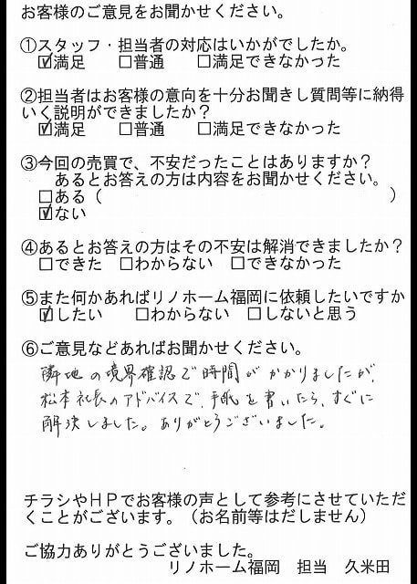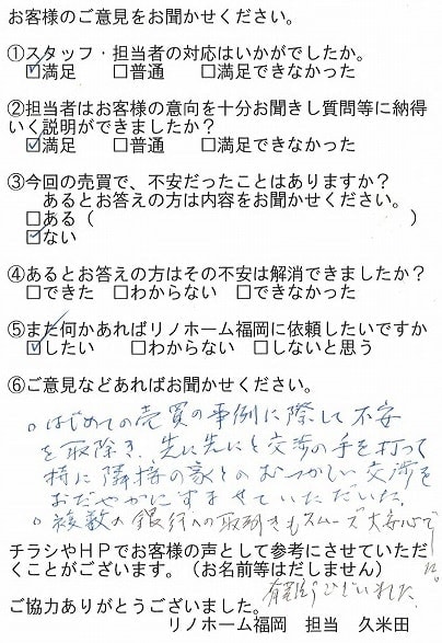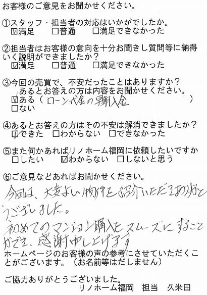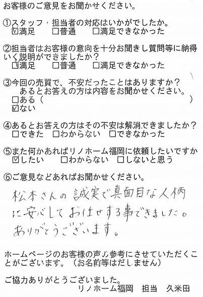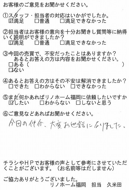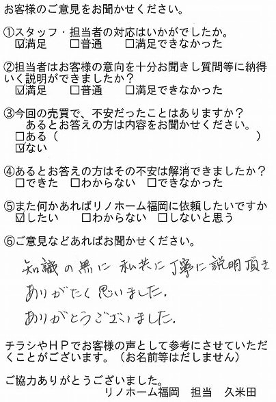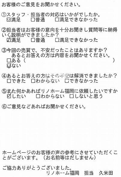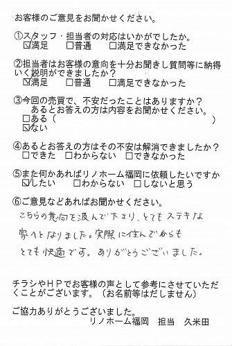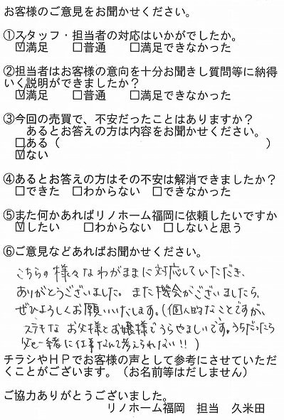 | 福岡市博多区 マンションを購入のお客様 | 担当者さんの誠実でまじめな人柄に安心してお任せすることができました。ありがとうございます。 |