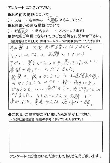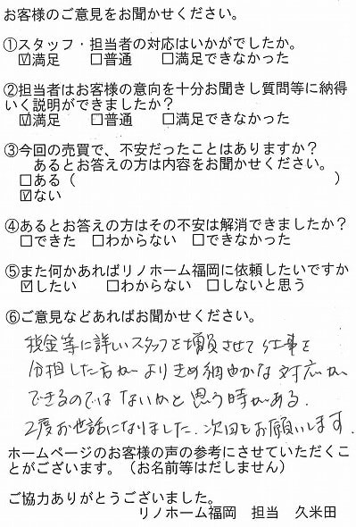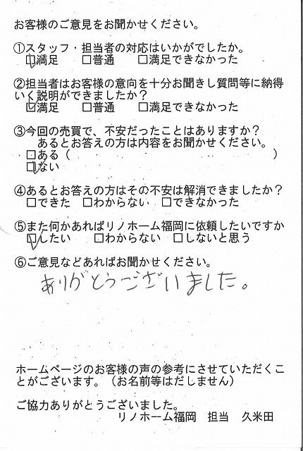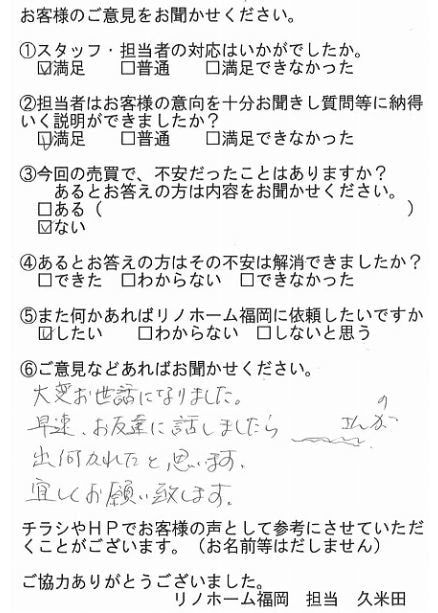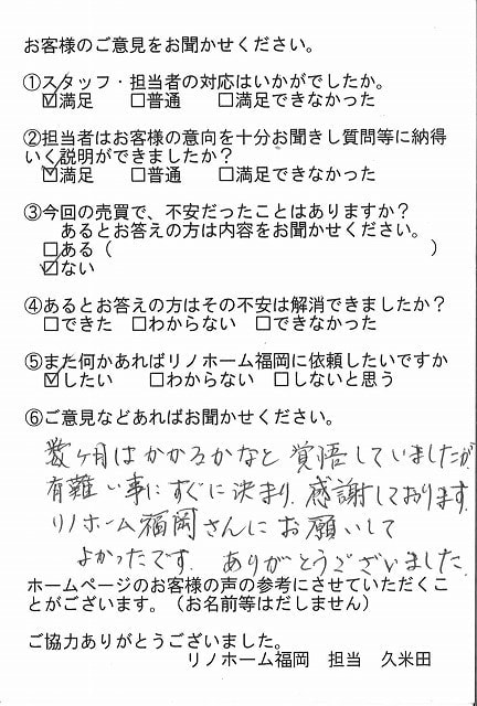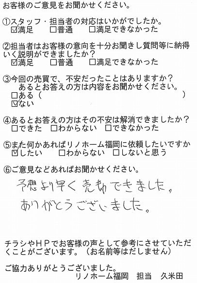 | 福岡市博多区 マンションを売却のお客様 | 予想より早く売却できました。ありがとうございました。 |