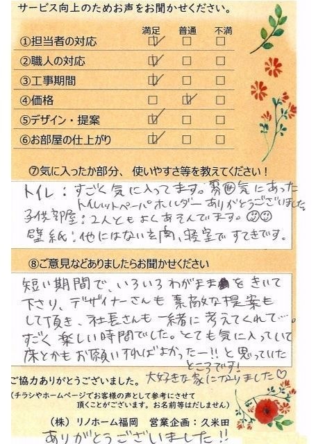 | 福岡市博多区 マンションを購入のお客様 | 知識のない私共に丁寧に説明頂きありがたく思いました。ありがとうございました。 |