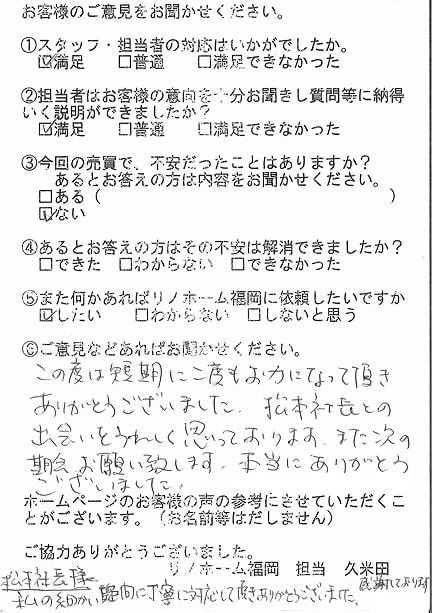 | 福岡市中央区 マンションを購入のお客様 | 長い間、私どもの夫婦のわがままにお付き合いして頂き、誠にありがとうございました。おかげさまで満足いく物件に出会うことができ、大変感謝しております。また機会があれば何卒よろしくお願いいたします。 |